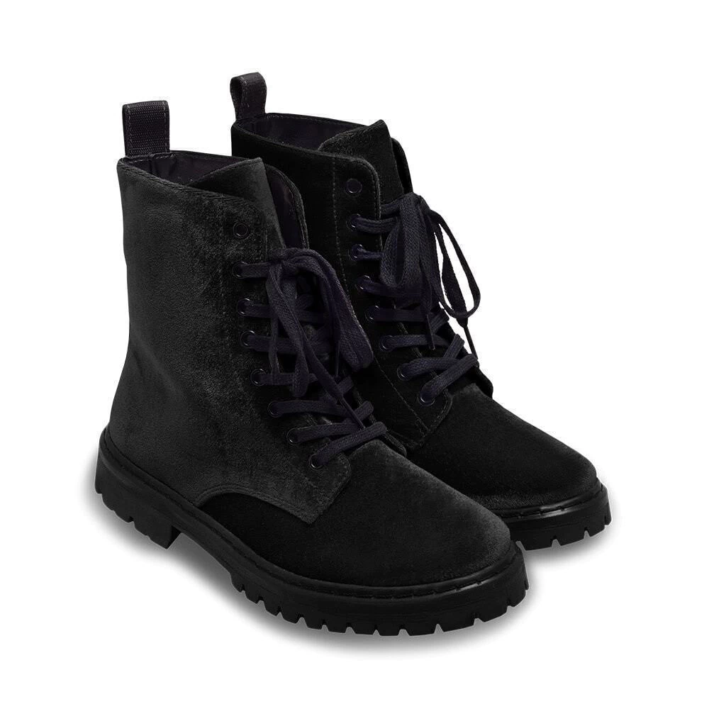 Coturno tratorado confeccionado em veludo molhado, com acabamento macio e toque aveludado. Possui forro interno em material têxtil respirável, que garante conforto térmico ao longo do dia. O solado é em borracha tratorada reciclada de alta resistência, com ranhuras profundas que oferecem excelente aderência e durabilidade.